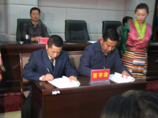 (图为陈鸿代表和桑珠次仁代表交接仪式签字)