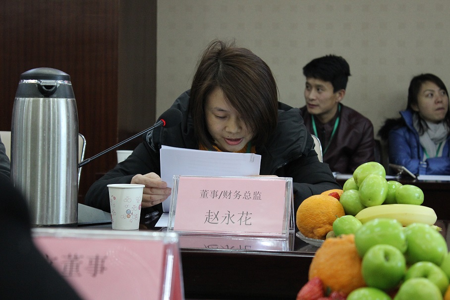 (图为董事兼财务总监赵永花作财务工作报告)