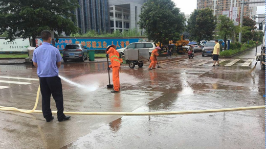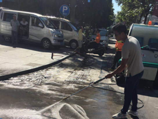 ▲对重点交易市场、政府广场周边清洗作业