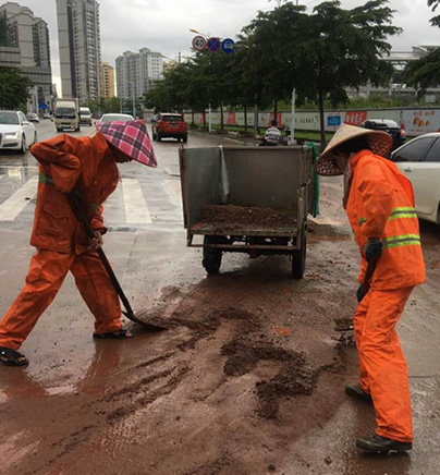 ▲环卫工人清理暴雨过后积泥
