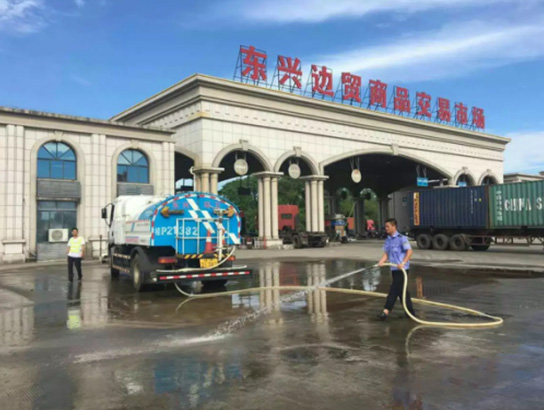 ▲对国门口岸旅游热点景点进行冲洗作业