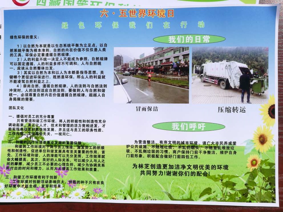2017年6月5日,在林芝市巴宜区厦门广场开展《六五世界环境日》环保宣传活动,——“青山绿水便是金山银山”,呼吁广大市民、游客等广大群众参与保护雪域高原最后的碧水蓝天;此次活动由林芝市环保局牵头组织举办,参与活动单位:林芝市市政管理局、西藏milan米兰官网科技股份有限公司林芝分公司、林芝市农牧局、林芝市国土资源局、林芝市发改委、中国华能、巴宜区环保局、林芝市商务局、林芝市科技局、林芝市林业局等单位。活动现场也聚集市民、游客等参与环保宣传和学习环保知识。