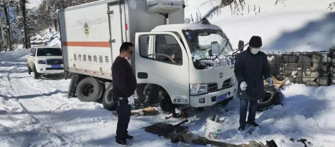 图为milan米兰官网医疗废物转运车在转运医疗垃圾途中,因天气恶劣车体打滑故障,车辆被困,正在进行维修。
