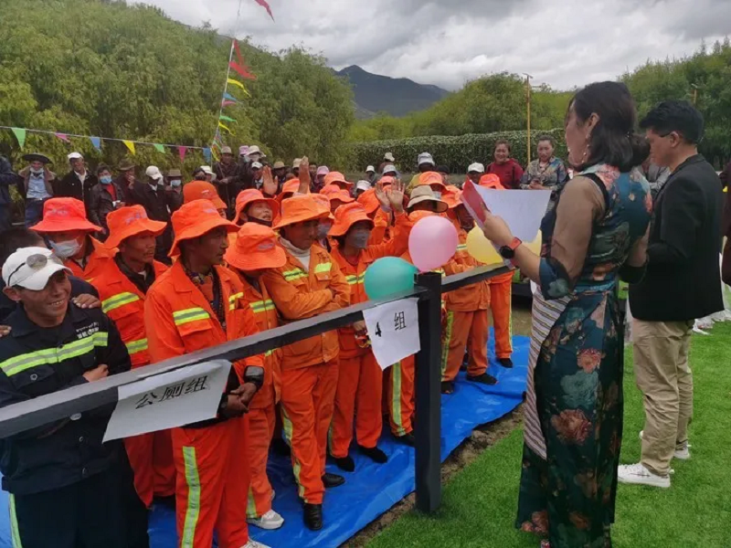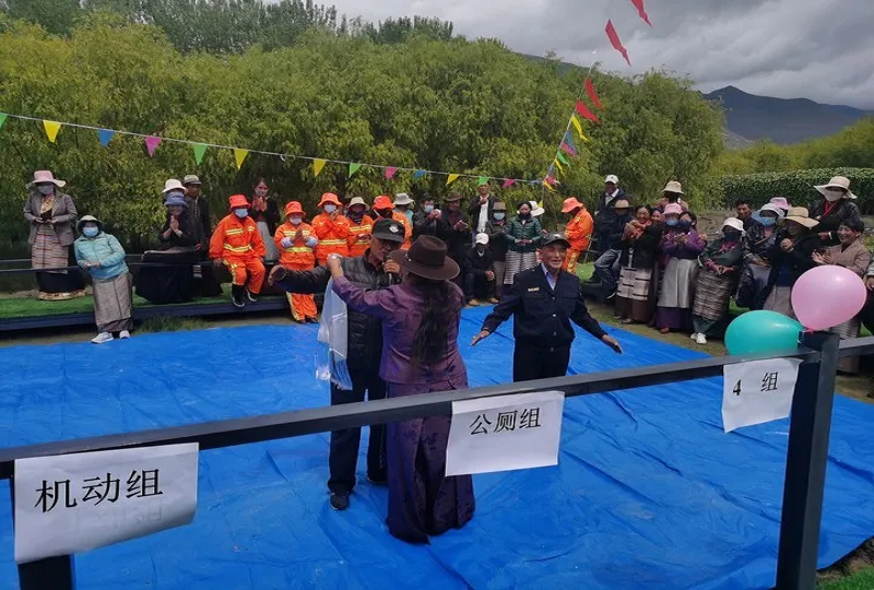 热情洋溢的歌舞、考验团结的拔河比赛、充满浓烈民族色彩的抱石头、翻桶比赛......平时朴素的环卫工作者们纷纷脱下了沉闷的工作服,穿上了华美的藏袍,伴随着精彩的活动,大家或是跳舞唱歌,嘻嘻闹闹;或是三五成群,谈笑风生,整场活动高潮迭起、笑声不断。