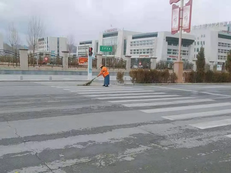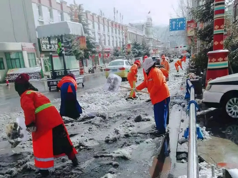 日喀则分公司一线环卫工人以雪为令全力投入到除雪工作中,做到人随雪动,“雪未到,人先来”,确保各主次干道见本色、无积雪、无残留的标准。