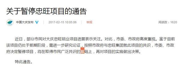 黑龙江大庆市委宣传部官方微博今日发布《关于暂停忠旺项目的通告》称,近日,部分市民对大庆忠旺铝业项目进展表示关注。对此,市委、市政府高度重视。鉴于目前该项目仍处于前期阶段,需进一步研究论证,按照市政府与忠旺集团就此项目的共识,市委、市政府决定暂停项目,将在取得市民广泛共识的基础上,再对项目的实施做出决策。